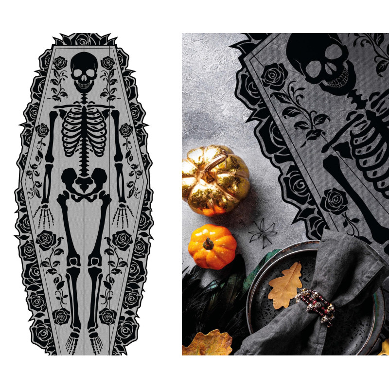 Chemin de table squelette dans cercueil. Taille: 183x60cm.
