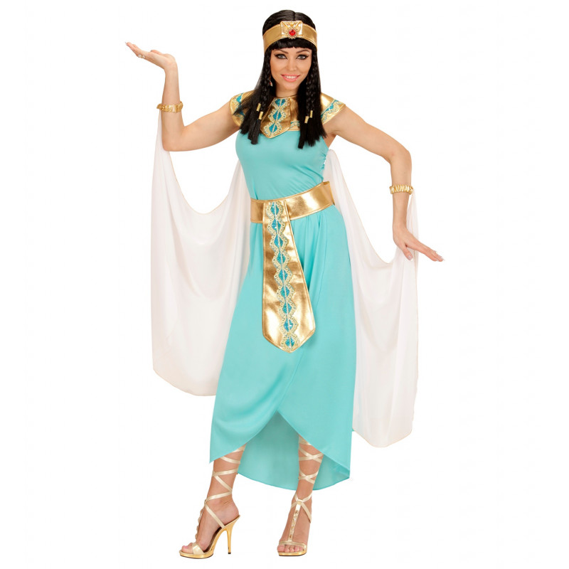 Ce déguisement de reine d'Egypte contient: robe, ceinture, col, manchettes, coiffe, cape.