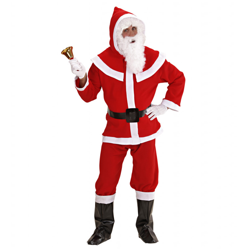 Ce déguisement de père-noël, en flanelle, contient: veste, pantalon, ceinture, capuche, surbottes, perruque, barbe avec moustache et sourcils.
