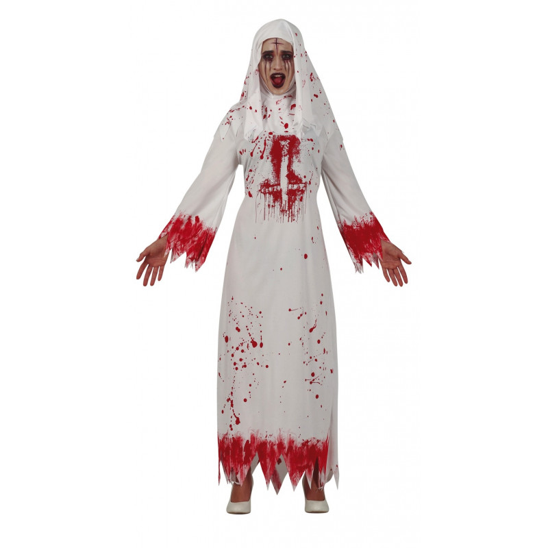 Ce déguisement de nonne blanche ensanglantée contient: robe, coiffe.