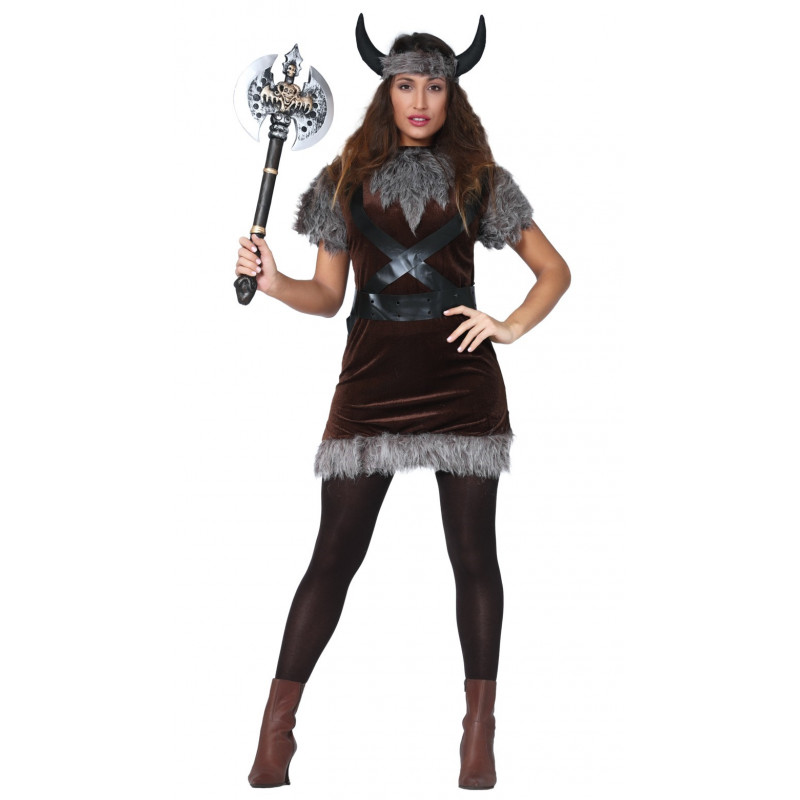 Ce déguisement de viking contient: cornes, robe avec rubans, ceinture.