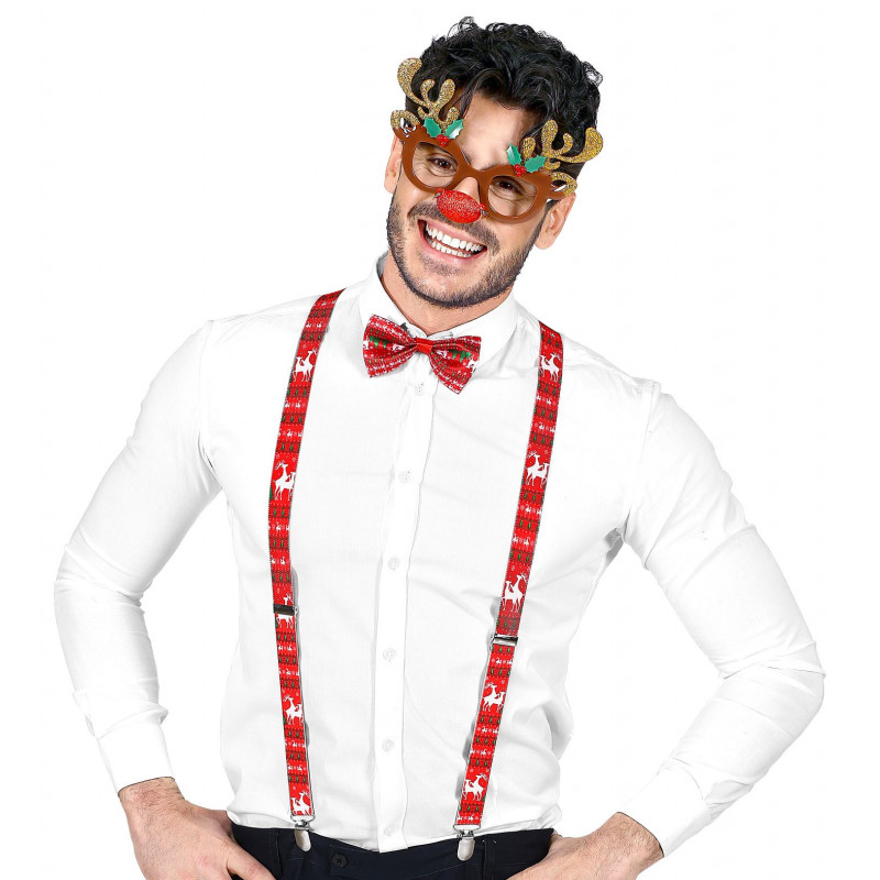 Ce set de noël "Renne" contient: lunettes, bretelles, noeud papillon.