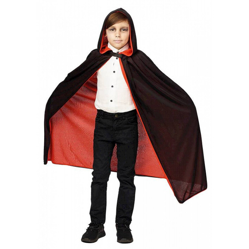 Cape enfant noire doublée rouge avec capuche. Longueur: 90cm env.