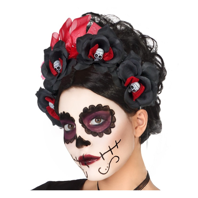 Serre-tête Day of the dead avec crânes. Noir et rouge.