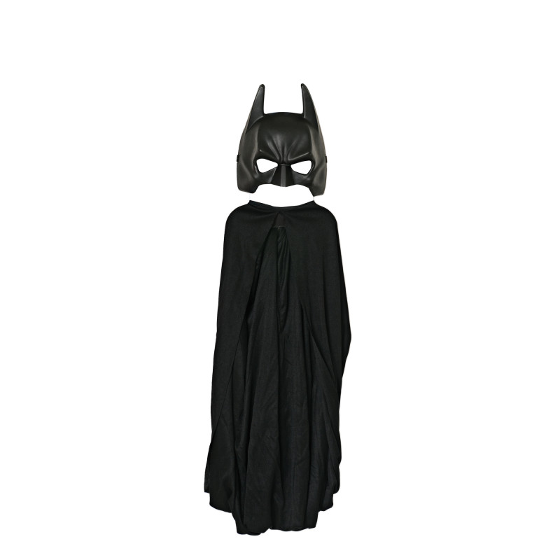 Ce kit de batman contient: Un masque en PVC noir avec oreilles à l’effigie de Batman. Attache élastique à l’arrière avec système de fermeture velcro. Une longue cape en tissu jersey noir avec attache velcro au niveau de l’encolure.