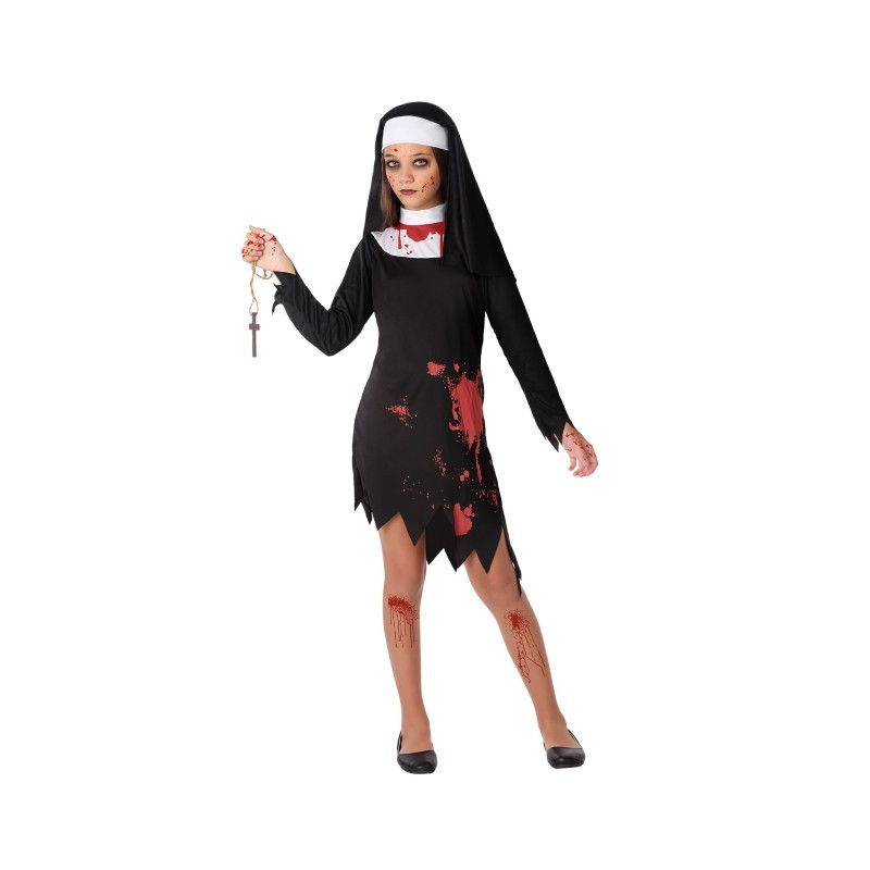 Ce déguisement de bonne soeur, ensanglantée, contient: robe, voile.