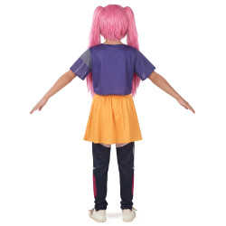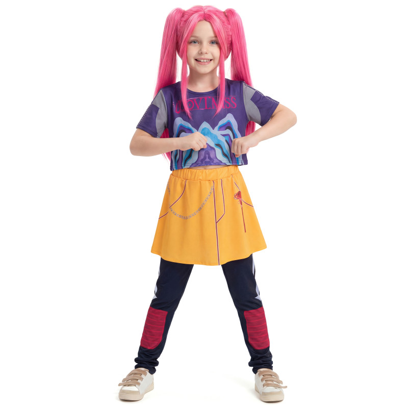 Ce déguisement de danseuse Kpop "chasseuse de démon", content: un t-shirt violet imprimé, d’une jupe jaune avec chaîne décorative et d’un legging intégré bicolore.