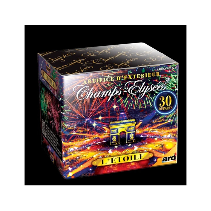 Compact Champs-Elysées 'Létoile". Effets: Queue de comète rouge, couronne brocade à rouge, queue de comète verte à étoiles vertes et scintillant or, queue de comète verte, couronne brocade à vert, queue de comète rouge à étoiles rouges et scintillant argent, queue de comète argent à palmier argent et final crépitant. Catégorie: F2, 30coups, durée: 25sec, hauteur: 30M. Produit disponible uniquement en click and collect.