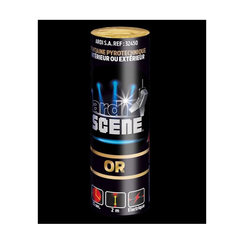 Jet de scène, hauteur: 2M, durée: 25sec. Or. Catégorie T1, à utiliser en extérieur. Produit disponible uniquement en click and collect.