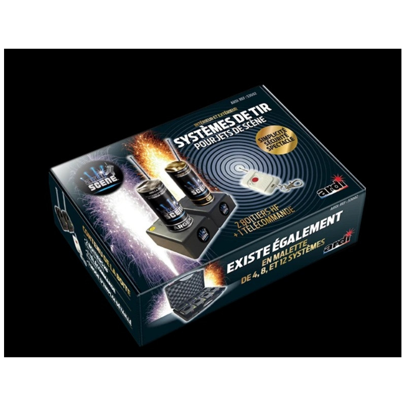 Boîte de 2 systèmes de tir pour 2 jets de scène. Sans fil. A utiliser en extérieur. Produit disponible uniquement en click and collect.