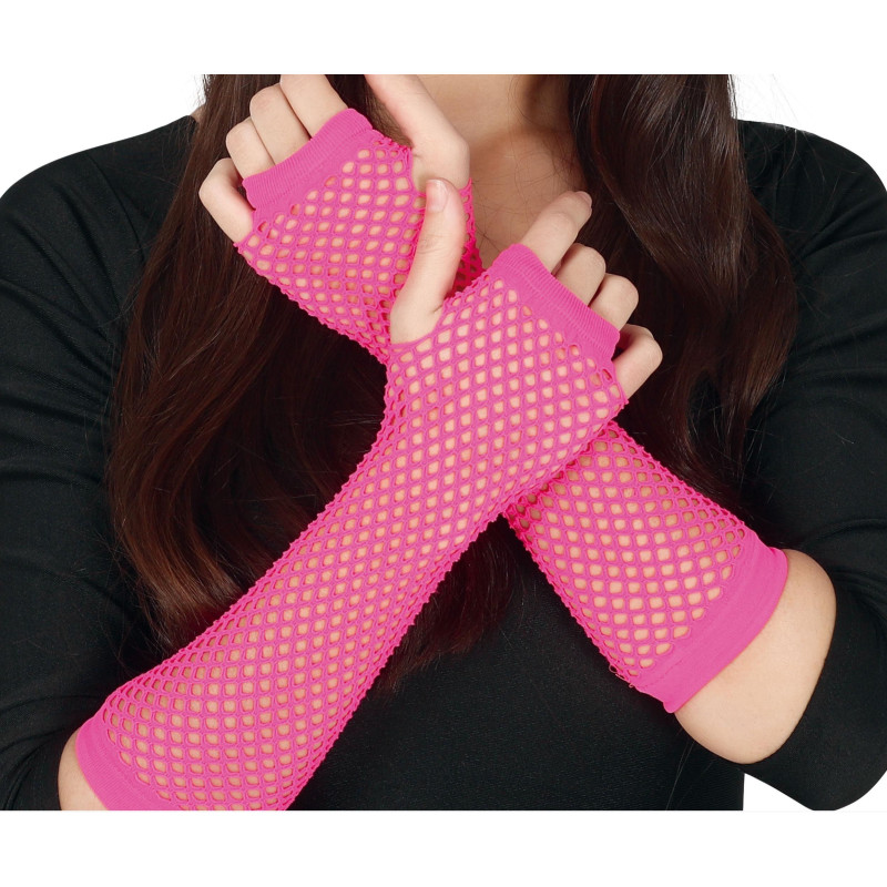 2 mitaines en maille rose fluo. Longueur: 26cm.
