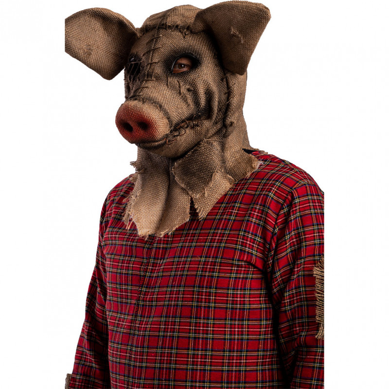 Masque de cochon en toile de jute avec mâchoire mobile.