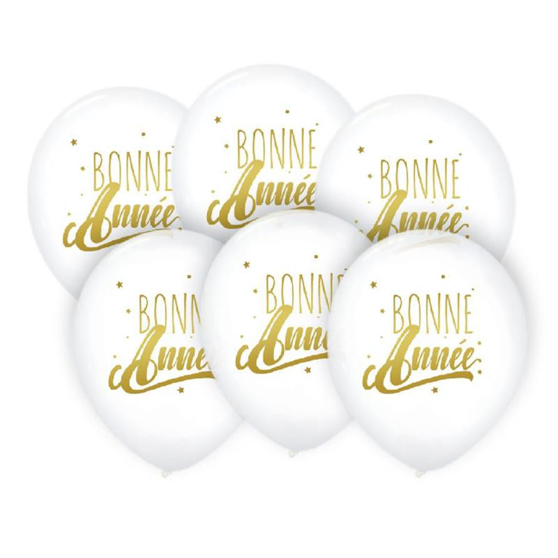 Lot de 6 ballons blancs avec inscription "Bonne année" or.