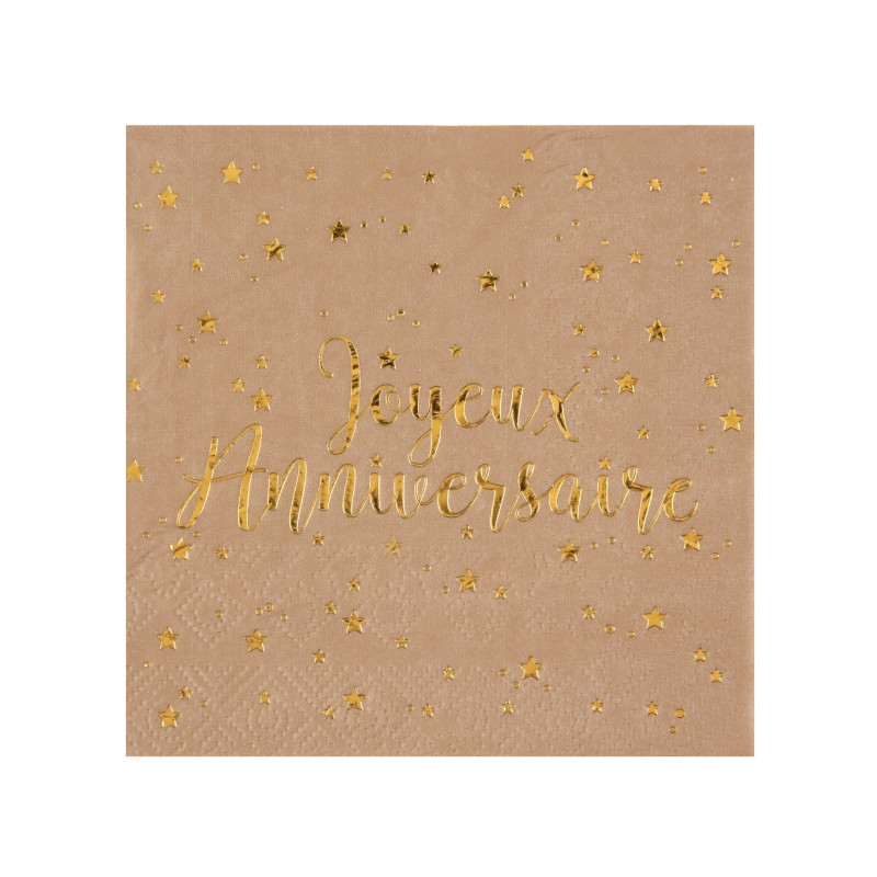 Lot de 20 serviettes "Joyeux anniversaire" kraft. Taille: 12.5x12.5cm.