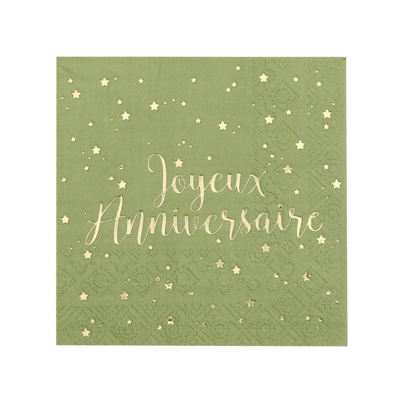 20 SERVIETTES 25x25cm JOYEUX ANNIVERSAIRE SAUGE
