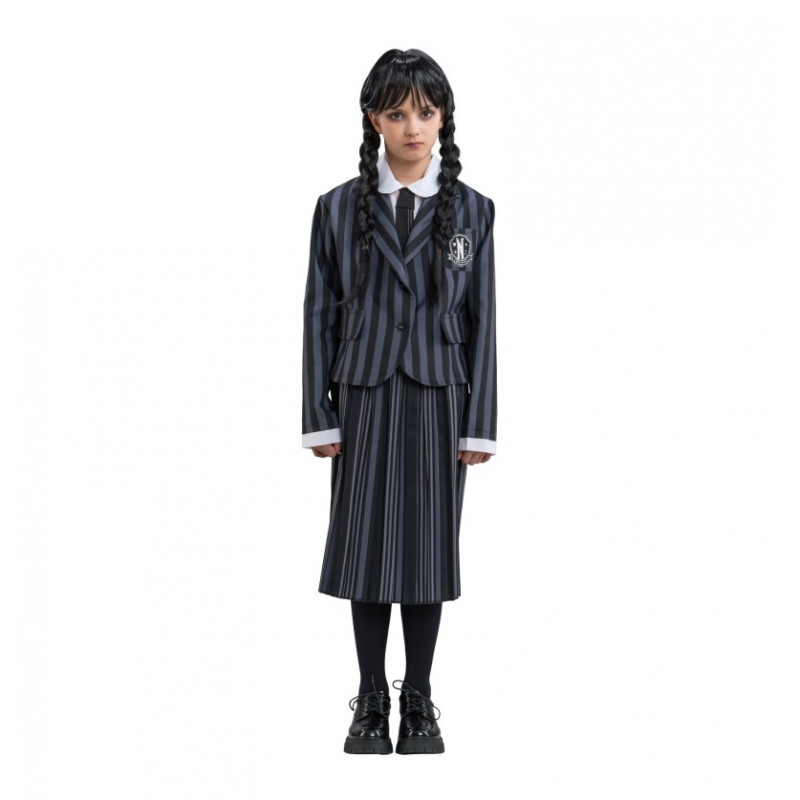 Ce déguisement de Mercredi contient: veste, plastron avec cravate, jupe. Uniforme officiel.