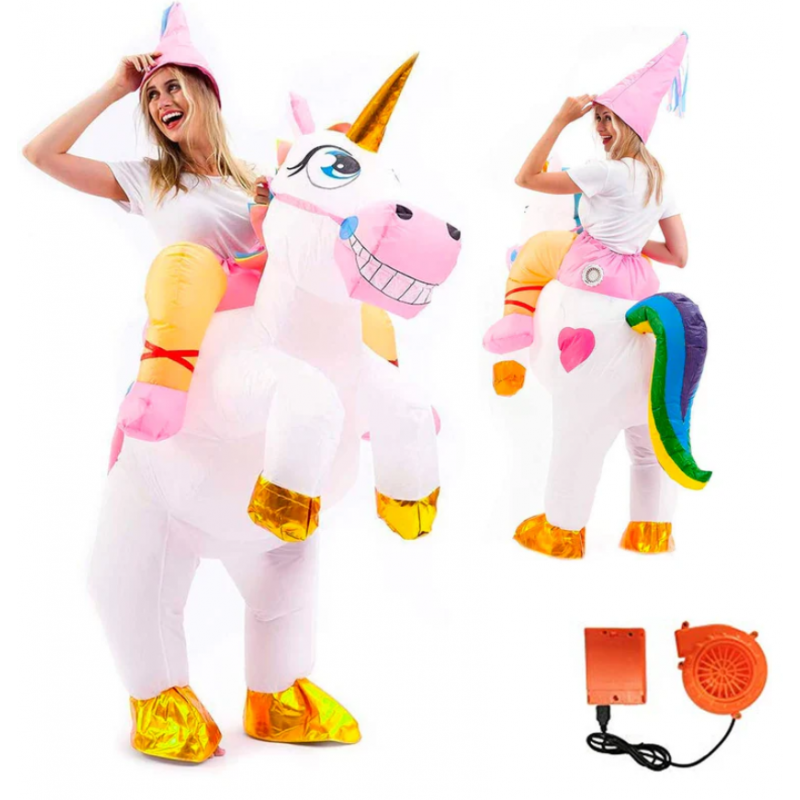 Déguisement gonflable insolite de Licorne. Facile à gonfler grâce à ses 2 ventilateurs intégrés fonctionnant avec piles (type AA non fournies). Hauteur: 180cm.