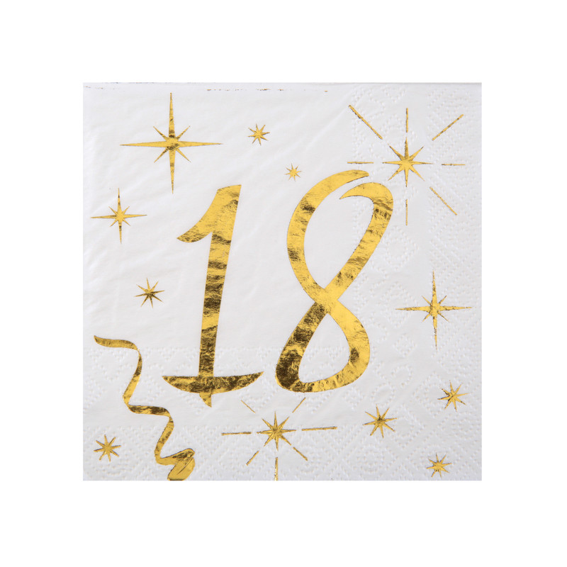 20 serviettes 18 ans or/blanc. Papier 3 plis, taille: 12,5x12,5cm.